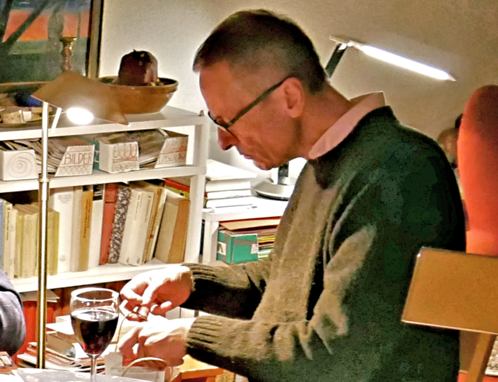 Der BBA war am letzten Januartag zu Gast in den Räumen seines Mitglieds Anja Steinig. Die Grafikdesignerin hatte in ihrem Studio F in Berlin-Kreuzberg eine Vielzahl von Büchern und Katalogen ausgebreitet. Das überspannende Thema war: Ausgefallene Schriften – Typografie als Gestaltungsmittel. Ergänzt von den vielen Mitbringseln der Mitglieder entspann sich schell eine anregende Diskussion um den Stand des Designs, die Frage nach Lesbarkeit vs. Aufmerksamkeit, Schriftkultur und zeitliche Moden. Die Bandbreite der versammelten Beispiele war groß, von einem typografisch interessanten Originalplakat von Lucian Bernhard für eine Kriegsanleihe im Ersten Weltkrieg über Dinah Nelkens »ich an dich. Ein Roman in Briefen« aufwändige produzierte Liebesgeschichte aus dem Jahr 1939, komplett mit extra eingeklebten, beschriebenen Servietten, Liebesbriefen und Fahrkarten und ähnlichen Ephemera – das Konzept des komplexen und gerühmten »Das Schiff des Theseus« (2015) um fast 80 Jahre vorwegnehmend – bis zu Ausstellungskatalogen, Taschenbüchern, dem »Wohltemperierten Alphabet« von Axel Bertram, Jost Hochhulis »Buchgestaltung« und den onomatopoetischen Sprechblasen-Typografien von amerikanischen »Ren & Stimpy«-Comics. Anja Steinig und der befreundete Grafikdesigner Lo Breier (Tempo, Wiener, ARD, Die Woche, Bild Am Sonntag, ...) erzählten aus ihrem Arbeitsalltag als Gestalter, die Zwänge durch Kundenwünsche und den Widerstand gegen solche, beziehungsweise die lohnende Überzeugungsarbeit, wenn es um Ästhetik geht. Auch Details der technischen Entwicklung und ihr Einfluss auf die Gestaltung nahm Raum ein. Energiegeladen durch die Diskussion (und einen eigenhändig gebackenen Kuchen der Gastgeberin) verliessen wir weiter lebhaft unterhaltend Studio F einige Stunden später. Herzlichen Dank an Anja Steinig für ihre Gastfreundschaft!